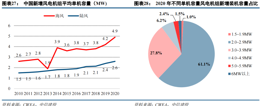 年,中国新增装机的风电机组平均单机容量为 2668KW,同比增长 8.7%,其中海上风电机组平均单机容量为4885KW,同比增长 15.2%。在新增风电机组中,2.0MW(不含 2.0MW)以下的新增装机仅占 1%;2.0 MW(含2.0MW)~2.9MW 新增装机占比达 61.1%,比 2019 年下降了 11%;3.0 MW(含 3.0MW)~3.9MW 新增装机占比 27.8%,同比增长 10.1%。大兆瓦风机要求大尺寸叶轮,风电叶片大型化趋势也十分明显。