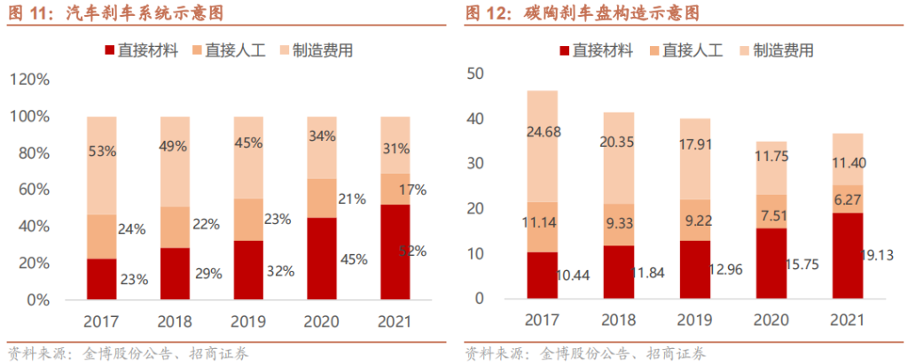 产品直接材料成本占比较低,存在较大技术、规模降本空间。以金博股份为例(公司全部产品系碳碳复合材料,成本结构代表性较强)。2021年公司热场系列产品单吨成本为37万元/吨,较2017年的46万元/吨下降了20%,2021年单吨制造费用为11.40万元,较2017年的24.68万元下降了53.8%,技术降本显著,2021年原材料成本占比为52%,随着规模扩大、技术升级、自动化水平提升和碳纤维价格下降,产品的降本空间巨大。当前碳陶刹车片单片价格约2500-3500元,对用C级及以上乘用车市场,狗子28 预计2025年单片价值有望下降到1000-1200元左右,将下探到B级及以上乘用车市场。