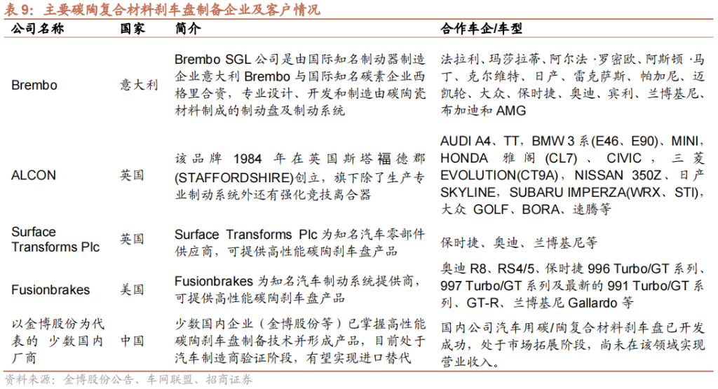 乘用车碳陶制动盘依据碳纤维状态可以分为两大类,分别是短纤盘和长纤盘。短纤盘国外居多,比较有代表性的是布雷博和西格里的CCM盘和CCB盘,其中CCB盘摩擦表面有一层耐磨的陶瓷涂层。长纤盘国内外均有,国外目前最顶级长纤盘是布雷博和西格里CCM-R盘,可以满足普通使用和赛道使用。国内长纤盘,包括两种,一种是不带耐磨涂层的C/C-SiC盘,另外一种是带耐磨涂层的P-C/C-SiC盘。
