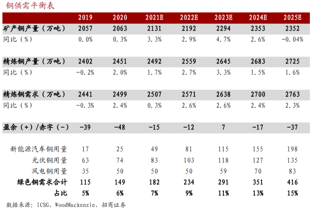 新能源车单月渗透率接近18%。根据中国汽车工业协会数据,2021年全国新能源汽车产量354.5万辆,全年渗透率13.6%,其中12月单月产量为52.2万辆,渗透率高达17.9%。预计2025年全球新能源汽车铜用量将达到198万吨,5年CAGR约52%。