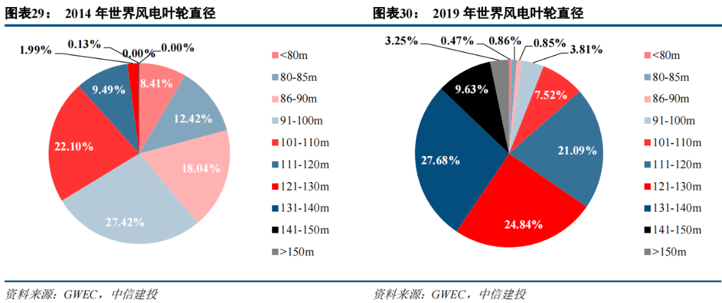 由于海上风电叶片尺寸及功率普遍高于陆风,叶片大型化趋势将持续加速。