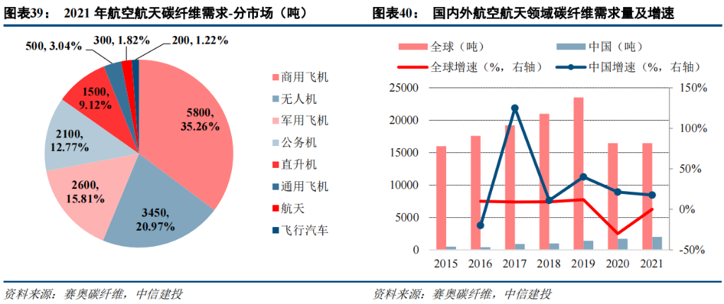 碳纤维的需求量最大,为 5800 吨,占比为 35.3%;其次是无人机,需求量 3450 吨,占比 21%;军用飞机碳纤维需求量 2600 吨,占比 15.81%。受疫情影响,全球民用航空市场萎缩,对航空航天领域用碳纤维的需求端造成不利影响,预计 2024 年以后将迎来明显恢复。我国航空航天市场过去基数小、增速快,随着新军机型的列装以及国产大飞机 C919 的逐步量产和 C929 的研发推进,十四五期间较全球仍有望获得显著的超额增速。