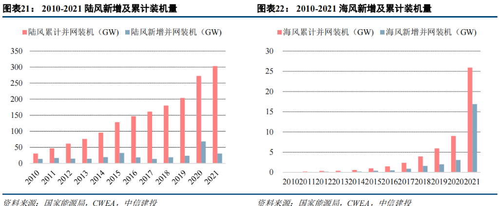 截至 2021 年,我国风电累计并网装机 329.26GW,同比增长 16.8%,其中陆、海风累计并网装机分别约为 303.37GW、25.89GW。海风资源优势更加明显,未来在海风装机增速将领先于陆风;