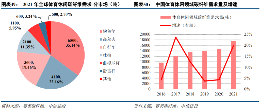 体育休闲成熟发展,碳纤维应用平稳增长。由于碳纤维的高比强度和高比模量以及诸多优良特性,使其可用来制造轻而强和刚而坚的各种制品,在体育休闲器材上得到了广泛运用,如高尔夫球杆、自行车等。2021 年,全球体育休闲领域碳纤维需求 1.85 万吨,其中钓鱼竿对碳纤维需求量最高,为 6500 吨,占比 35.14%,其次是高尔夫和自行车,分别占比 22.16%和 19.46%。中国在 2016~2021 年间,体育休闲领域碳纤维需求量稳步上涨,复合增速达 12.53%。2020 年,中国体育休闲领域碳纤维需求量首次被风电领域碳纤维需求量超过,预计未来将维持此格局;运动健康理念的普及,以及人均消费能力的提升,将驱动体育休闲市场长期平稳增长。